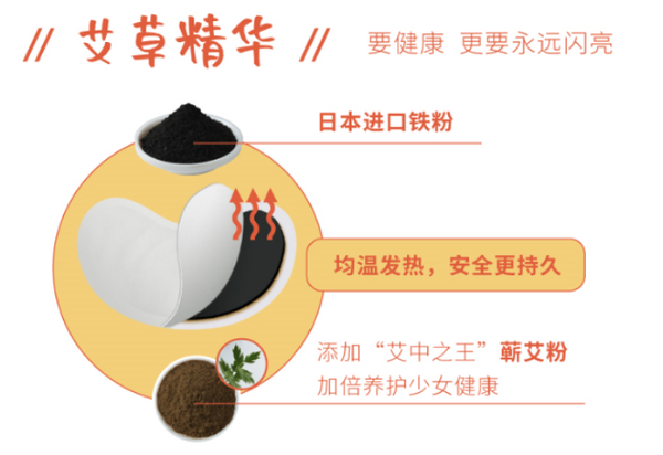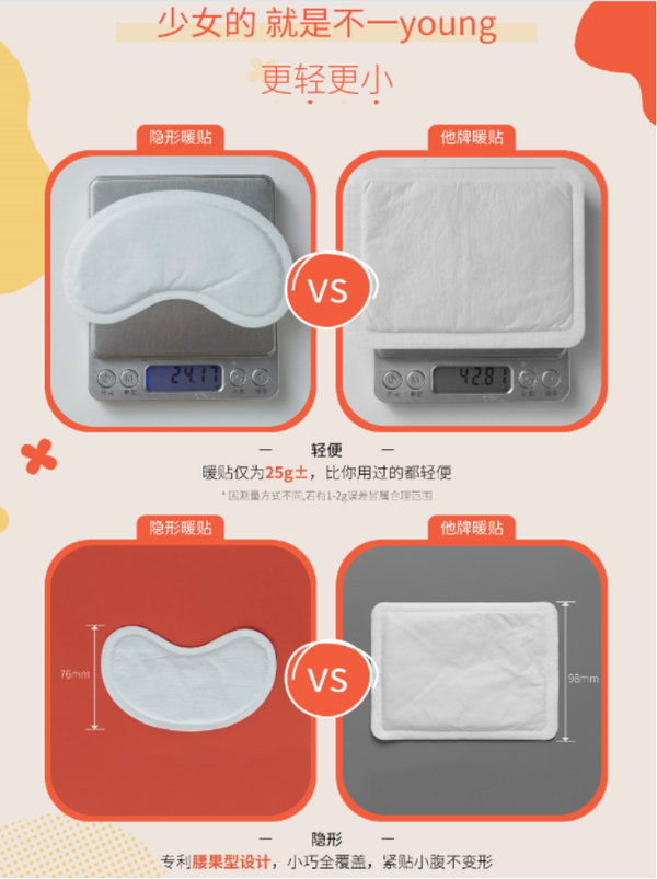 市面上的暖贴多为传统的白色长方形形状,克重高,比较笨重,运动或者外出场景会遇到抬手漏出边角的尴尬。也有小一点的暖贴,但是发热温度低,没感觉,发热时间短,并不能缓解痛经。好点的暖贴,发热温度稳定持久,但是贵,包装也不好看;便宜的暖贴呢,发热温度不持久,容易变形脱落。
