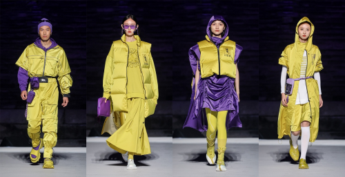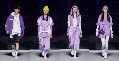 “宫宴“主题系列则是将唐代物质丰饶、四海咸平下的宫廷浮华、梦幻的气象进行了现代潮流语言的还原与讲述。服饰材质采用丝绸光泽面料,辅以浮华的立体绣花工艺,打造出辉煌华丽的金色质感;在色彩上,运用大面积的黄、紫等配色,观之更具奢华质感,在设计灵感上,宫殿以及酒具歌舞乐器,作为大唐宫宴的代表性符号被提取出来,以表达盛唐夜宴“人生得意须尽欢,莫使金樽空对月”的豪情,以及歌舞升平的繁荣气象。同时,设计中添加了诸多音乐元素及陕西历史博物馆的藏品元素,将 “唐潮”的艺术文化的潮流气息,以现代方式“质燥”了出来。