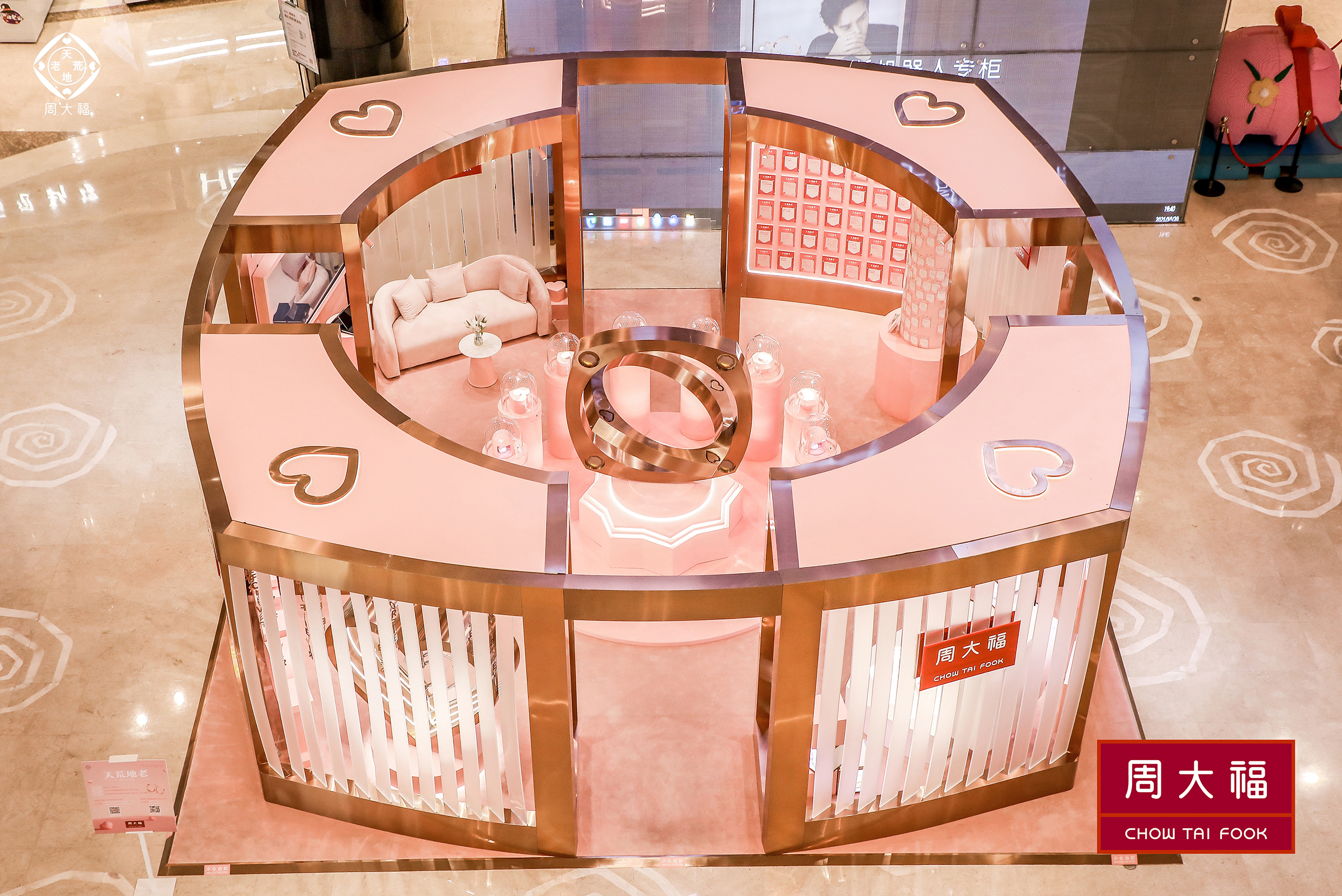 此次限时体验展以天荒地老戒指为原型,俯瞰外观形似一枚戒指戒面,粉金配色浪漫经典,外方内圆的整体通透式设计更是别出心裁,让馆内的精心布置一览无余,呈现出一方浪漫诗意天地。