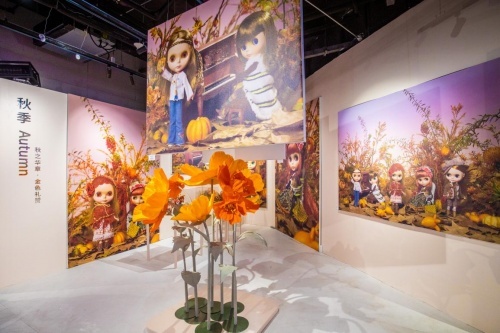 从这里开始,观众会看到一幅幅Blythe穿越四季花景的精美摄影展品。整场展览共30张摄影作品定格了Blythe在大自然中嬉戏玩耍、漫步沉思、聆听花语的各种瞬间,展现出Blythe在四季主题下多变的形象和充满个性的时尚潜力。