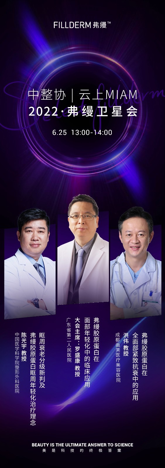 本场卫星会我们邀请到广东省第二人民医院整形美容激光中心主任罗盛康教授担任大会主席,两位特约讲者分别是中国医学科学院整形外科医院注射中心主任陈光宇教授,成都画美医疗美容医院院长洪伟教授,为大家带来弗缦在眶周与在全面部的临床应用课程。