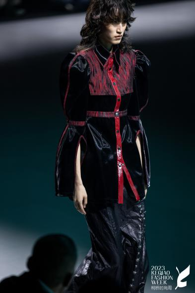 第三系列“年轻自定义”。展现对当下时事话题、社会现象的讨论与思考,并与风格化服装相结合,通过具有较强个性的服装作品表达个人体悟。将天马行空的想象力转化为颇具艺术效果的服装造型和面料图案,展现年轻设计师们的创新思维。