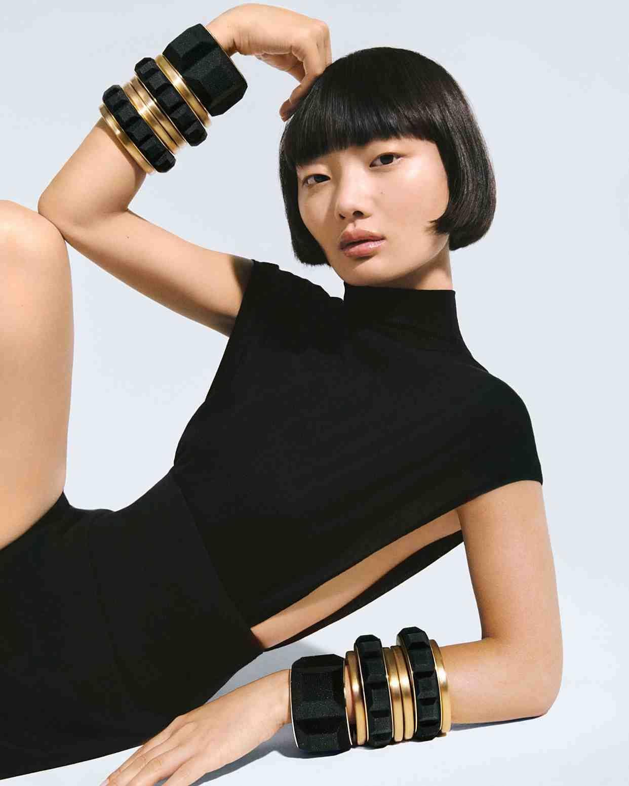 在全新概念款作品中,Claire Choisne力求超越技术层面的成就,焕新诠释Quatre系列的美学风格。她将这七件作品设计为可叠戴或单独佩戴的组合:一款饰有超大型巴黎饰纹(Clou de Paris)的黑沙及黄金材质手镯、两款同饰纹但尺寸更小的手镯、以及四款磨砂黄金手镯,共同构成完整套组。黑沙的选择经过深思熟虑,旨在与黄金的温暖质感形成极致对比。这种大胆而充满当代气息的美学风格,与Quatre系列的设计精髓相得益彰。