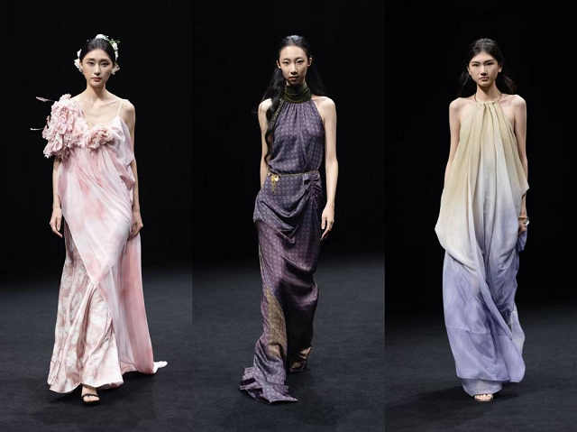 本季设计以印花面料为载体,融合流动光泽的铜氨丝、奢华垂坠的醋酸以及天然透气的天丝麻等多种材质,结合刺绣、扎染、提花、剪花等后整工艺,与数码印花技术实现多维交融。水的波纹借由压皱工艺具象呈现,而流畅的剪裁与贴合身形的设计则于无声处彰显女性的内在力量——色彩与团案随着身体姿态与光影流转而呼吸起伏,既捕捉“浔”与“洄”的动态瞬间,亦勾勒出刚柔并济的当代女性气质:与从容中见韧性,在柔美中蕴力量。
