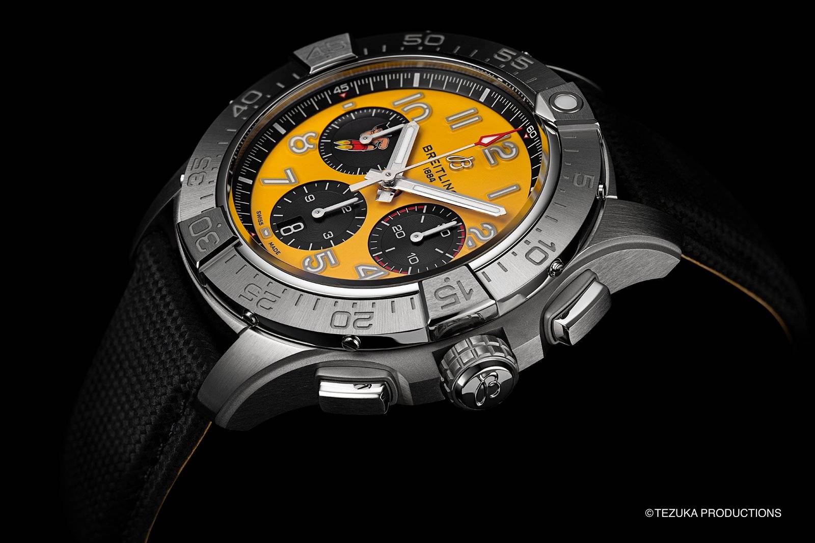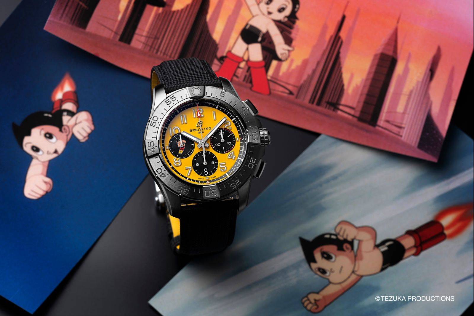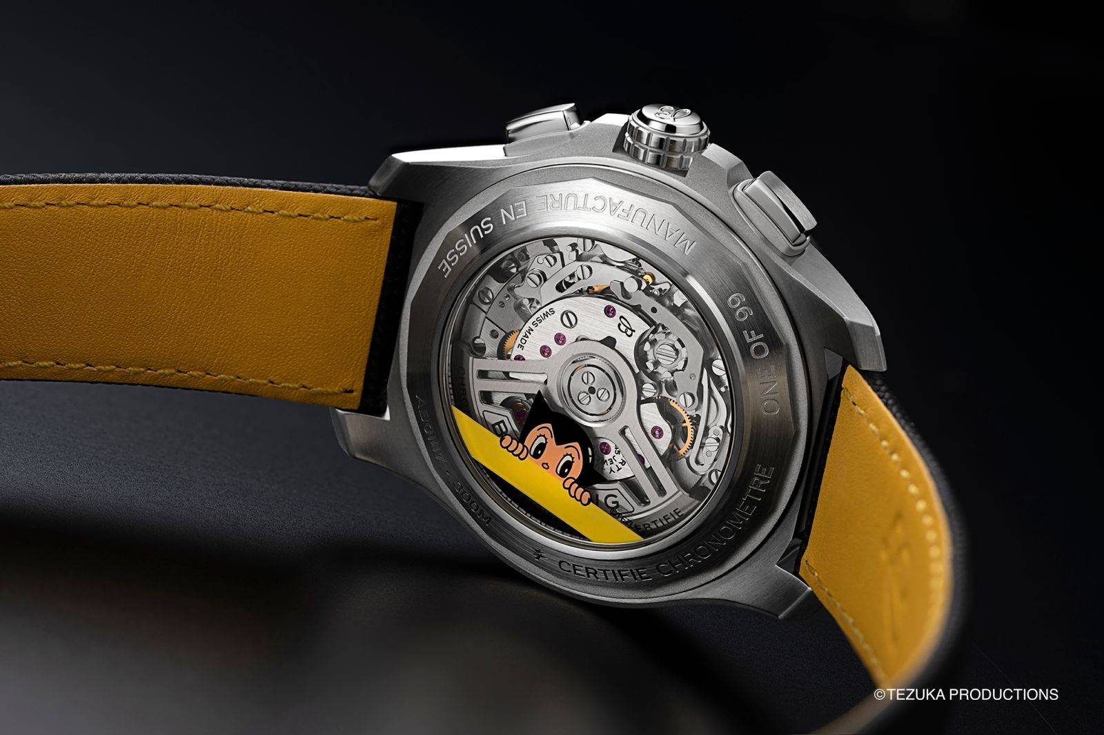 黄色表盘以及对比鲜明的黑色计时盘,9点位置计时盘内及表背饰有铁臂阿童木形象