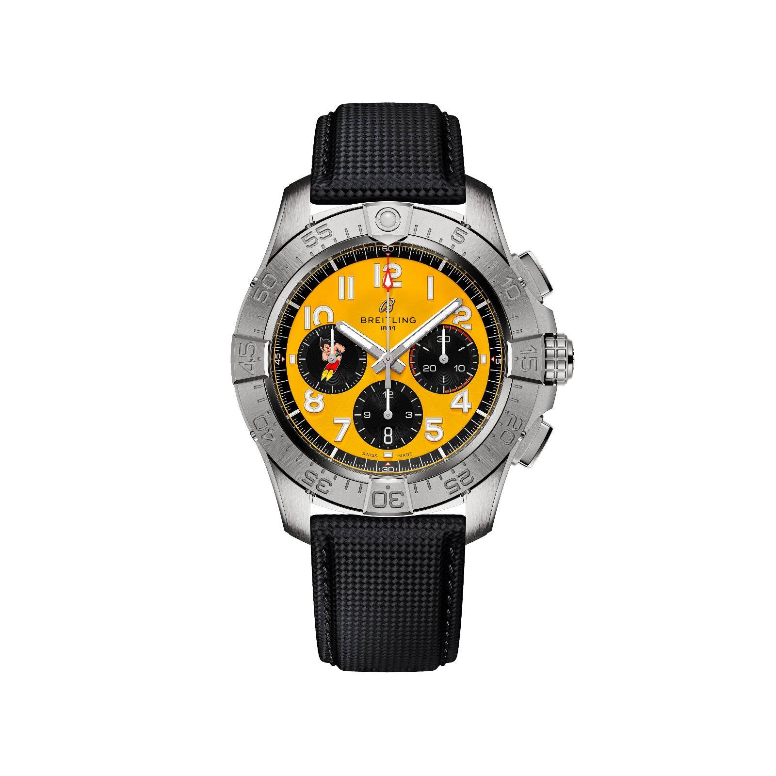这款限量腕表在延续复仇者系列经典设计语言的同时,通过精心布局,将铁臂阿童木元素注入其中。亮黄色表盘采用的不仅是百年灵最受青睐的标志色,抓人眼球之外,更呼应铁臂阿童木红色火箭靴喷射的火焰,象征强大能量。9点钟位置的小表盘饰以腾空跃起的铁臂阿童木形象,好似随时准备全力出击。其角型发型、红色火箭靴乃至蓄势待发的眼神均被细腻呈现。三个小表盘均采用唱片纹,与主表盘形成丰富视觉层次,而分钟计时盘与计时秒针尖端的红色相映,在分秒动态间彰显着百年灵制作计时码表的专长。