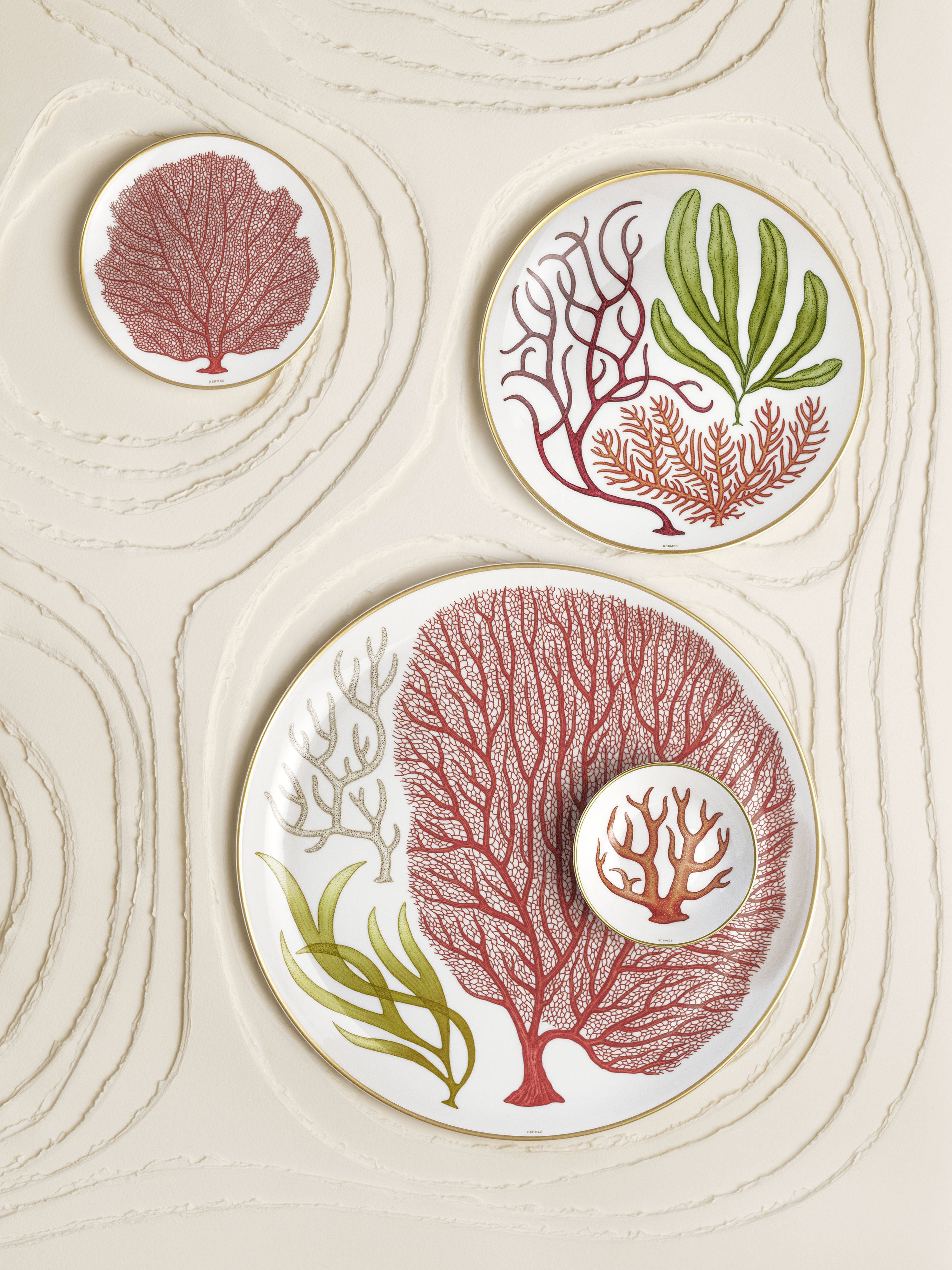 爱马仕家居世界艺术总监Charlotte Macaux Perelman与Alexis Fabry特邀英国艺术家Katie Scott从十九世纪英国园艺图鉴及威尔士海岸线海洋植物群中汲取灵感,以三十种灵动色调精心勾勒出点缀瓷器的百种植物形态,笔绘绮丽的海底花园。