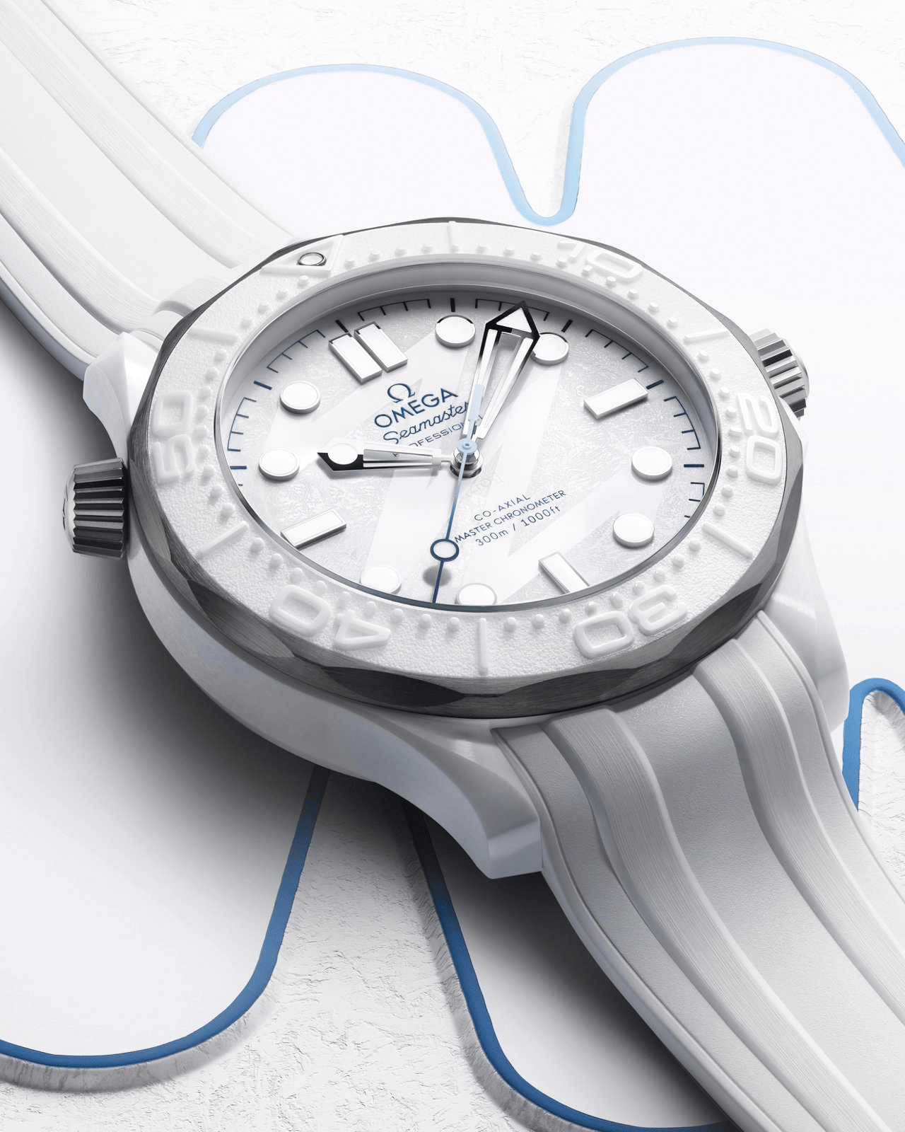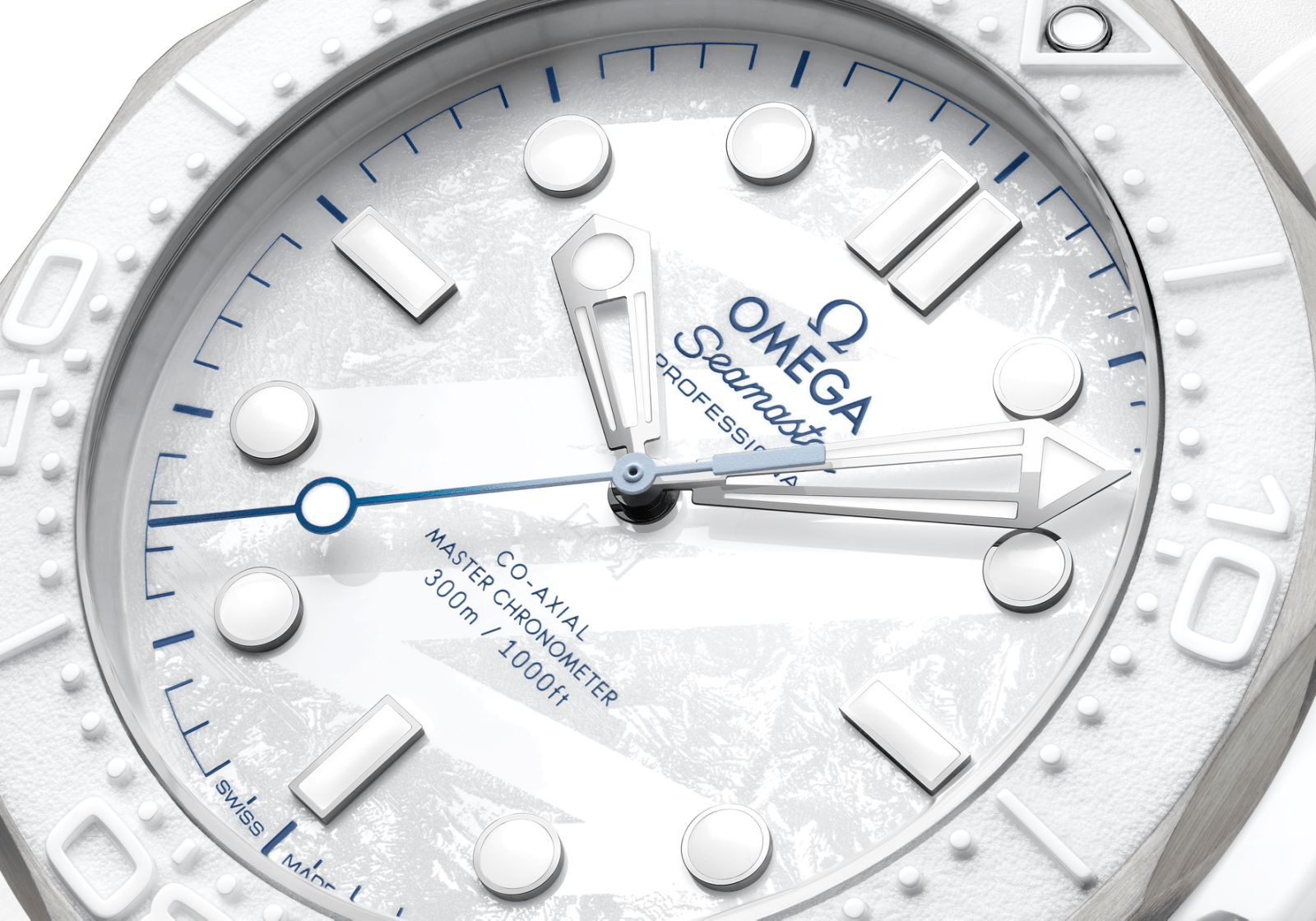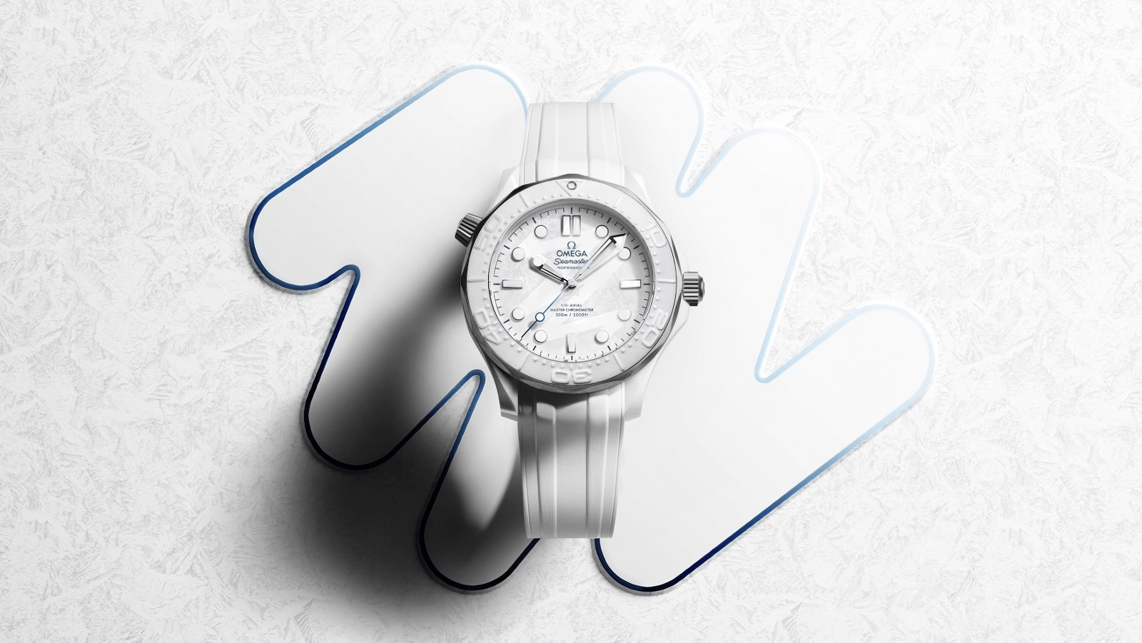 为诠释冬日冰雪的设计灵感,欧米茄匠心选用白色陶瓷与5级钛金属打造这款腕表,这两种材质赋予腕表光滑晶莹的美感,以及轻盈耐用的特性。腕表采用多种处理工艺,呈现出丰富的对比效果,包括经抛光与拉丝处理的表壳,经喷砂处理的排氦气阀门和表冠,以及采用激光烧蚀浮雕潜水刻度的白色陶瓷表圈。