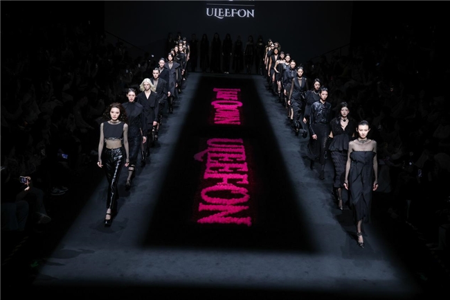 配合现场背景板上“LEAF CROWN × ULEEFON”的投影标识,以及模特面具上的粉色生物纤维装饰,粉色字母装置在黑色秀场中形成一条充满生命力的视觉动线——黑色是生命积累的厚度,粉色是破茧而出的光芒,二者递进呼应,既清晰构建出“从蛰伏到新生”的叙事线,又将“走向重生”的生命哲学与“绿色可持续”的品牌主张直观呈现在观众眼前,实现了时尚美学与环保理念的完美共生。