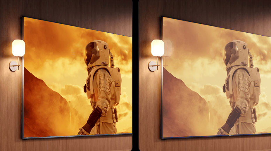 传统电视在白天观看时,屏幕经常会反光,甚至能清晰地倒映出家里的吊灯和家具,非常影响沉浸感,看久了眼睛干涩疲劳。为了打造极致的舒适视觉,小墨E5S Pro不仅有害蓝光直降42%,全新首发墨晶屏2.0更是将通透度提升了20%。低至2.6%的超低反射率,让夜晚观影时没有倒影,AG25防眩光技术避免了白天观影必须拉窗帘。